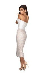 Boasting a timeless classic pattern, this graceful cocktail dress by Terani will surely be your next pick for parties. The fitted bodice showcases a strapless design with a single sleeve and a pleated pattern that adds an interesting edge to this dress. Overall embroidered fitted skirt with sequin-embellishments and scalloped hem gives this dress an effortless appeal.